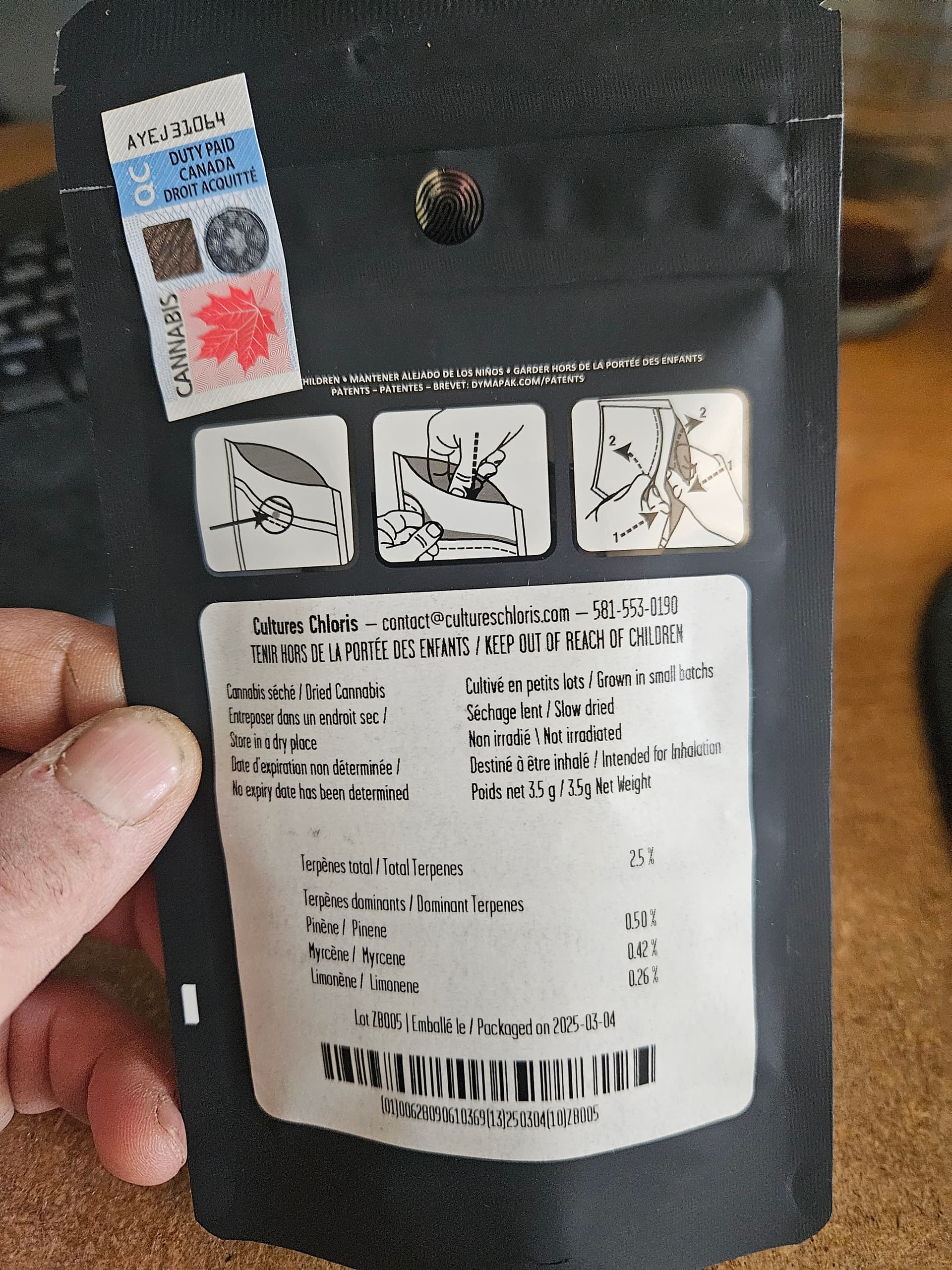 Le sac que j’ai reçu a été emballé le 4 mars 2025 et acheté à ma succursale SQDC locale.