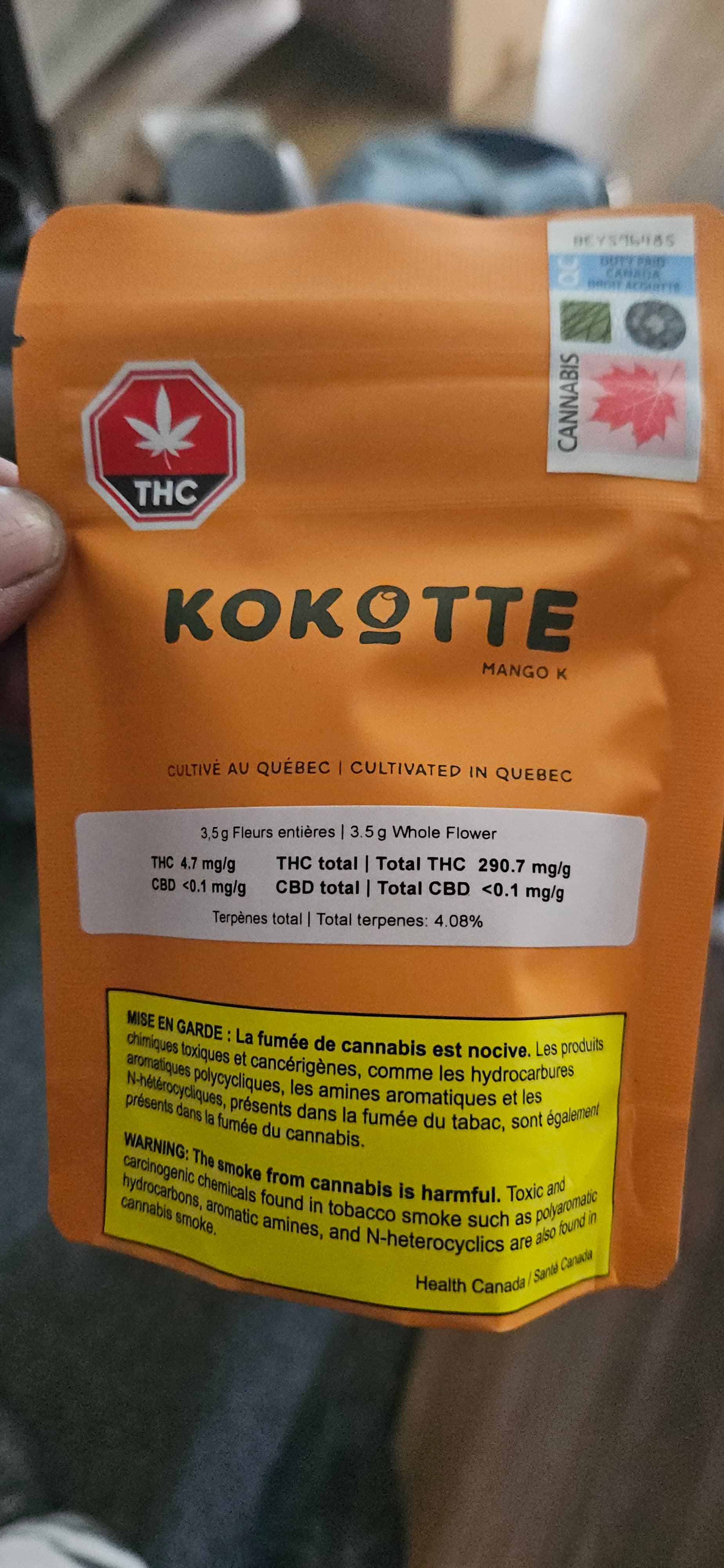 Le site officiel de Kokotte affiche un taux de terpènes entre 2,5 % et 4,5 % pour ce produit. Le petit sac que je possède indique un taux de 4,08 %, ce qui me place dans le haut de la fourchette — et franchement, c’est très acceptable pour un produit dans la gamme de prix de 25 à 30 $.