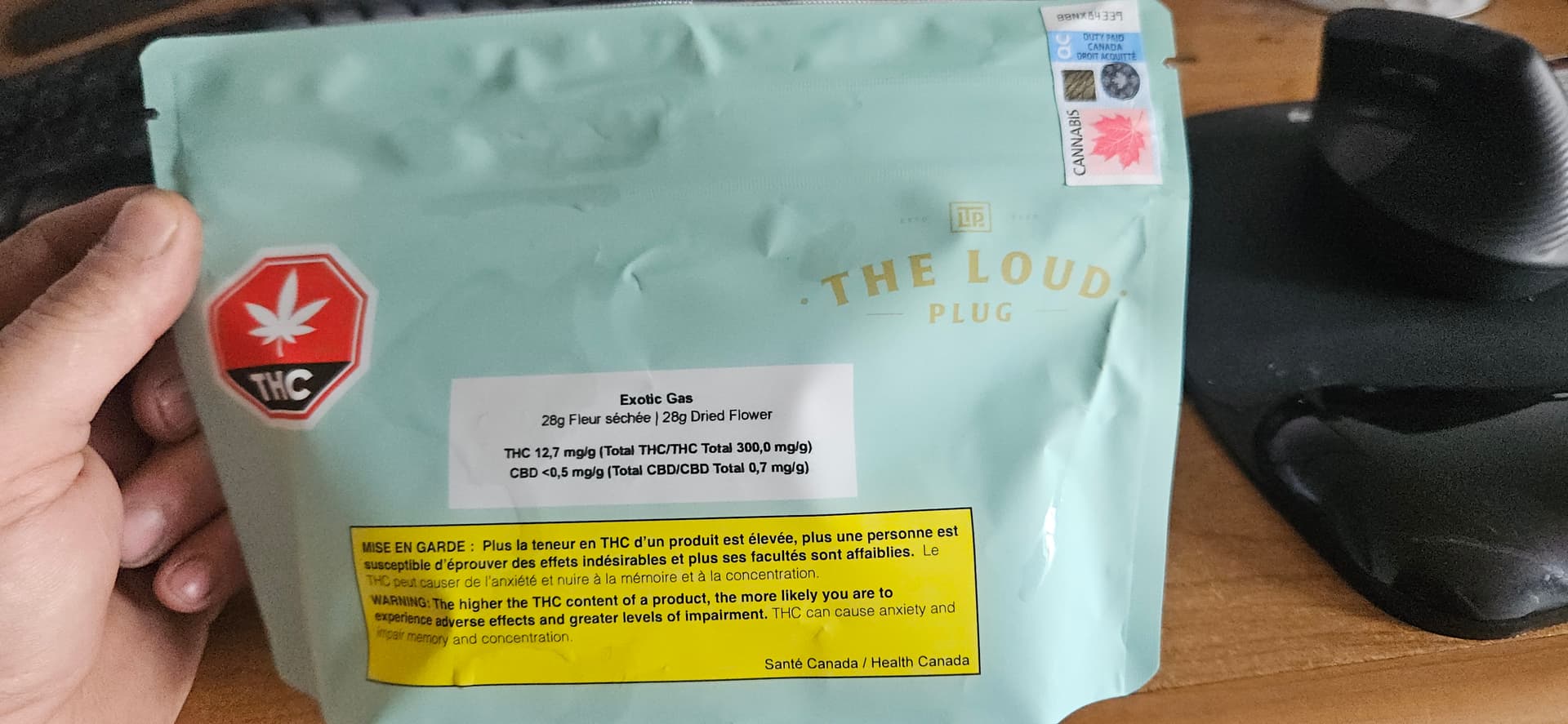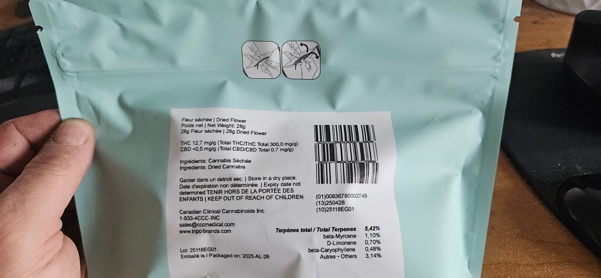 La batch que j’ai en main affiche le taux de THC maximal permis au Québec (30 %) et un taux élevé de terpènes : 5,42 %. Fait intéressant, les terpènes principaux listés sur le sac représentent moins de la moitié de ce pourcentage, ce qui permet de conclure que le produit présente un profil de terpènes riche et varié.